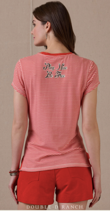 Like a little bowlegged lassoing cowboy character. This charming striped tee is embellished with a fun little cowboy that gives it just the right touch of twang, and of course, our favorite element – the Play Nice, Be Free emblazoned on the back. It’s an everyday piece you’ll really want to wear every day.