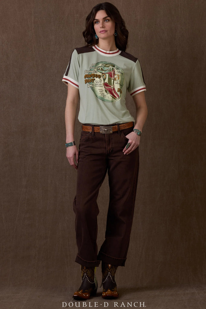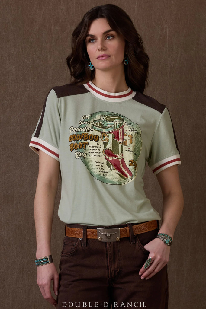 Remember the days of decoder rings? You’d save up your gum wrappers or popsicle sticks or whatever and earn yourself a decoder ring to decipher some secret message (think, A Christmas Story’s Ovaltine). Well, we thought it’d be fun to play up that nostalgia in a charming retro tee, complete with a ringed collar and cuffs, graphic print, and embroidered accents.