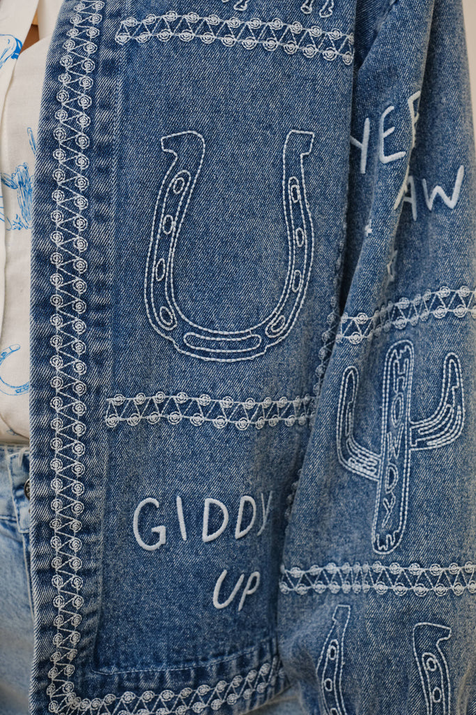 Relaxed-fit denim jacket featuring western-inspired embroidery of horses, boots, and cacti throughout. Designed with a round neckline, puff sleeves, and elastic cuffs for a casual yet detailed look.