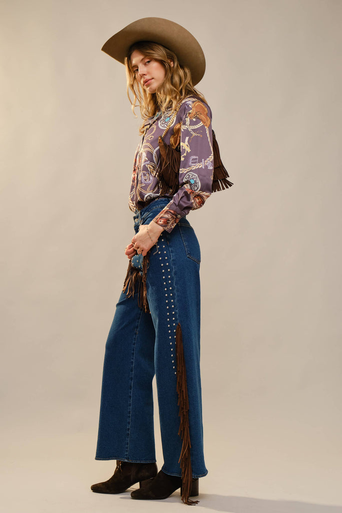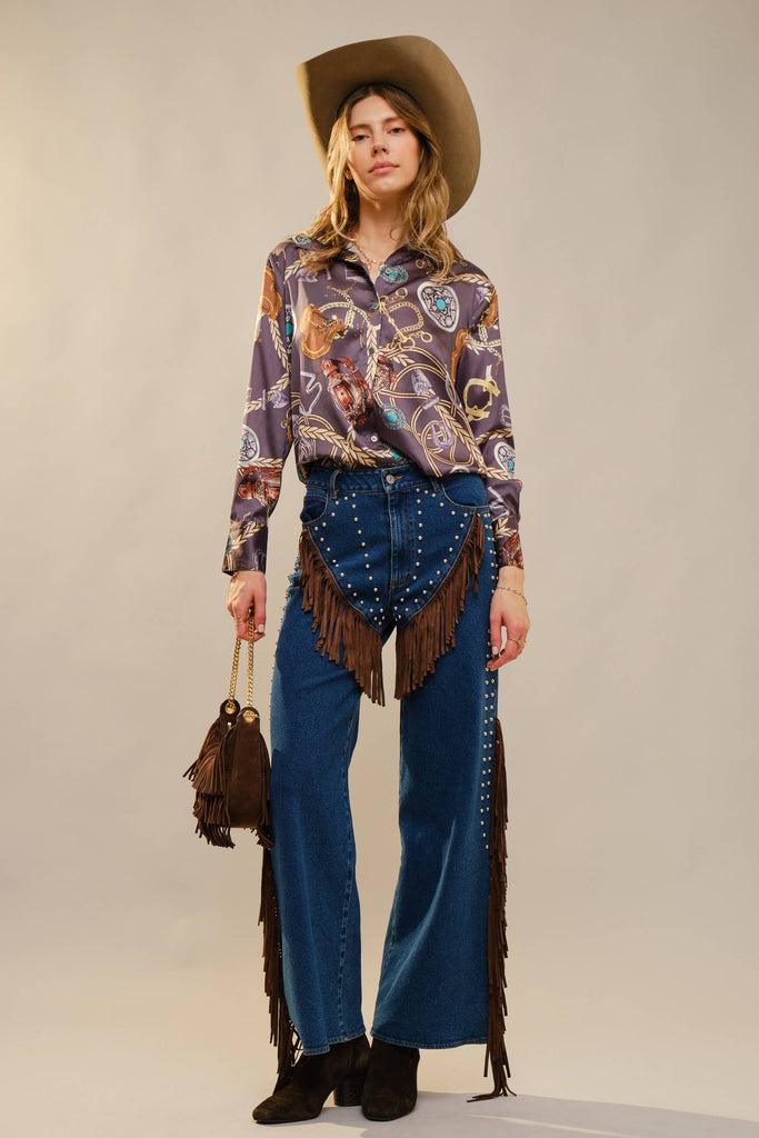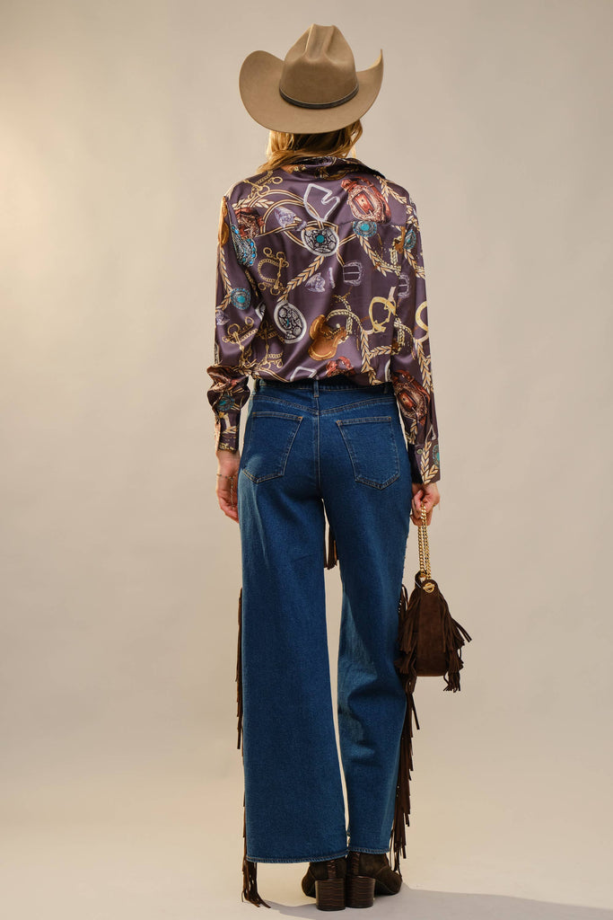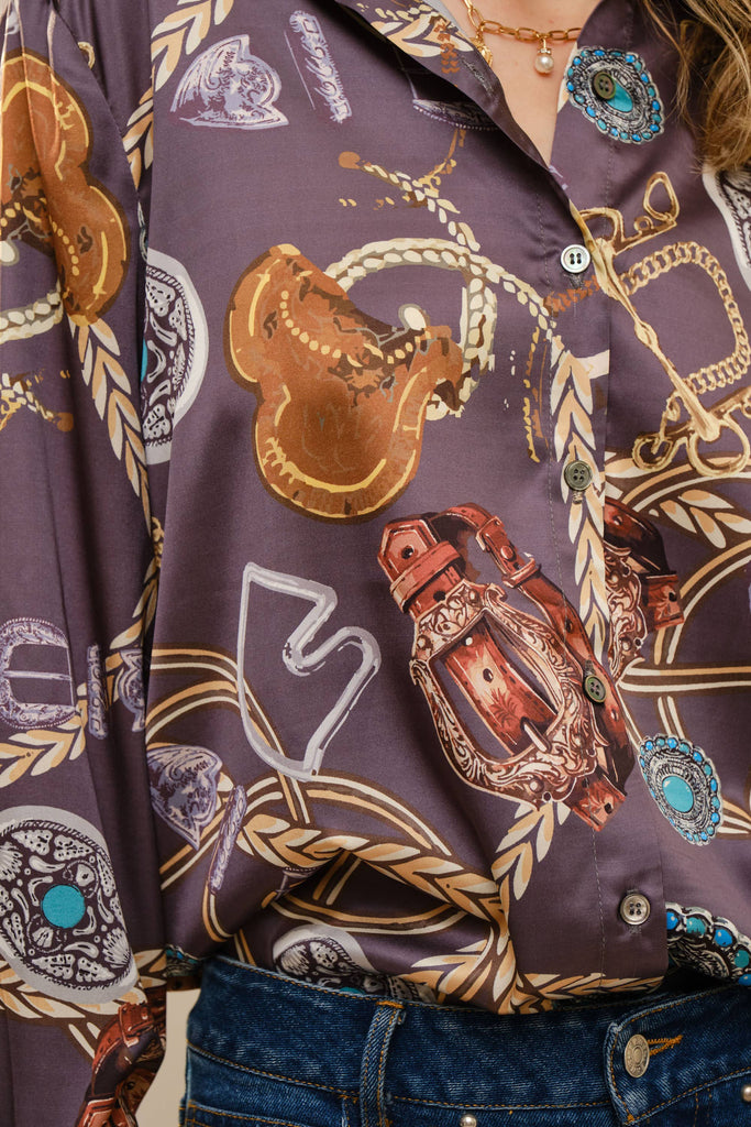 Satin long-sleeve button-down shirt featuring an allover Western-inspired print with turquoise concho, rope, and saddle motifs. Designed with a relaxed fit, classic collar, and smooth finish for a polished, statement look.