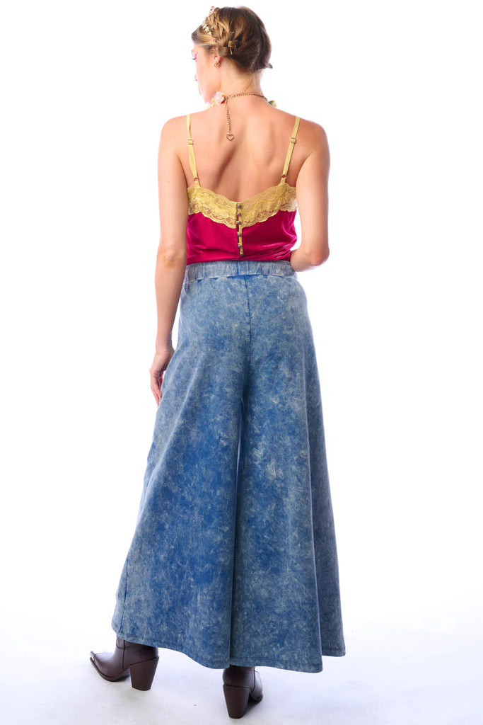- French terry wide leg elastic waist pants with decorative crystal buttons & pearl crystal pin attached to the pockets