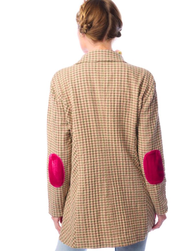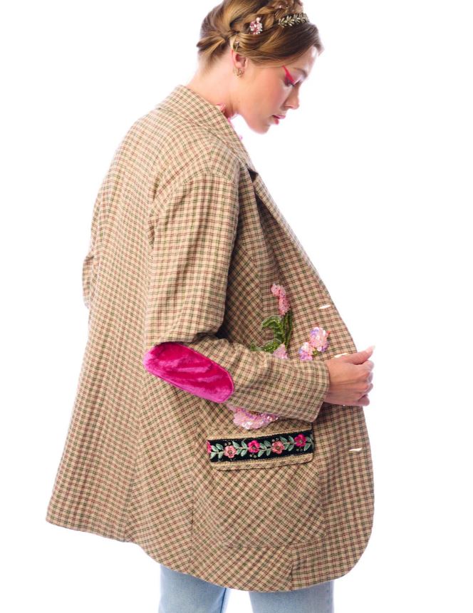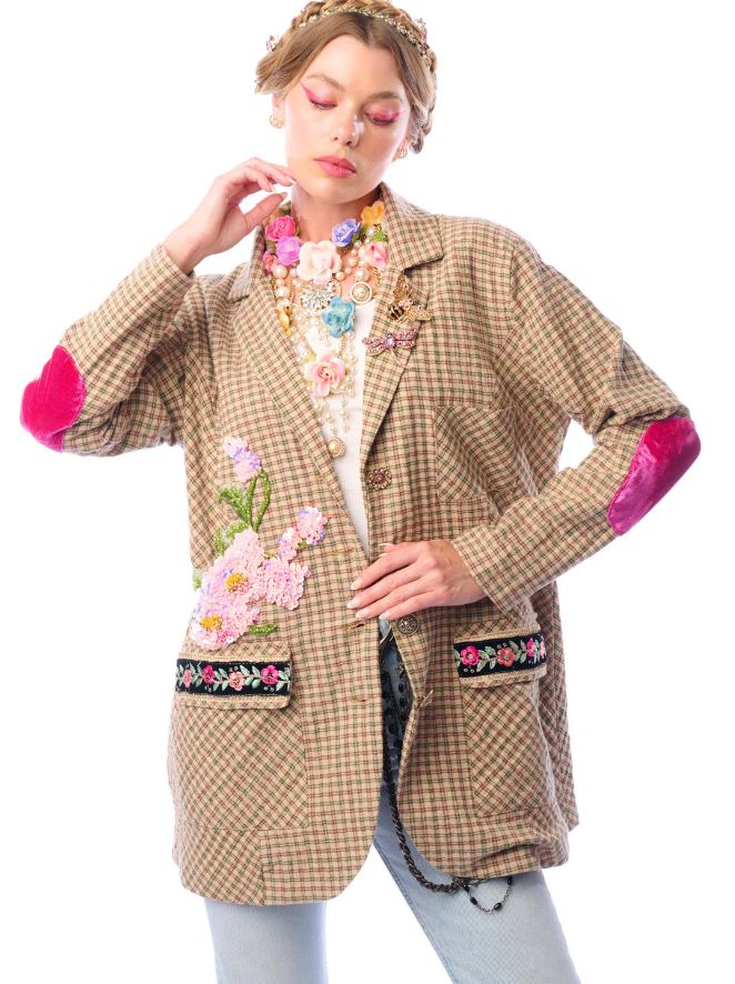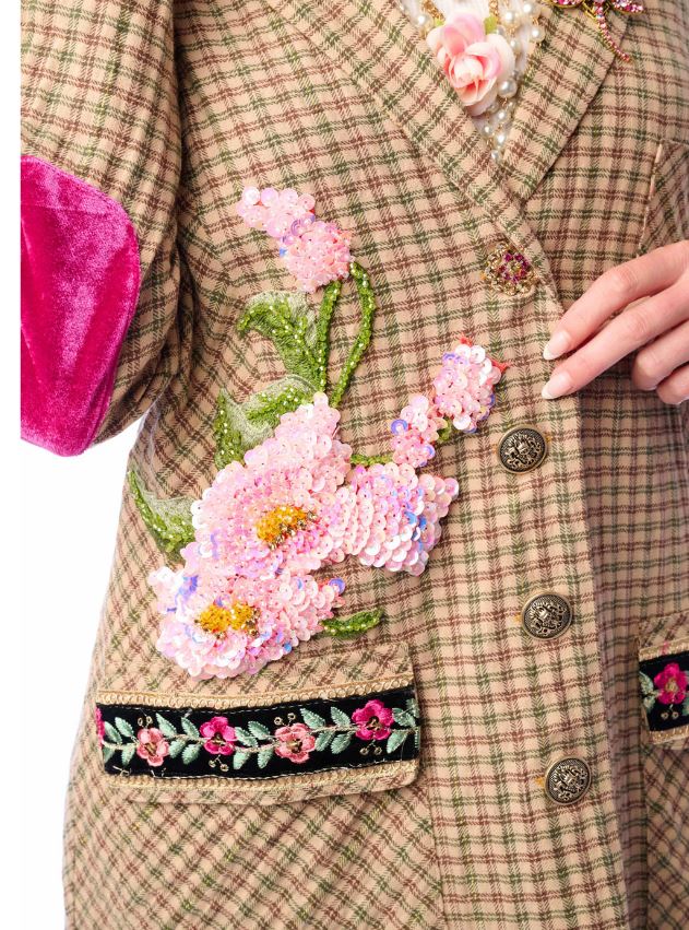 • Checker plaid lined button-up blazer, front closure with 1 floral crystal button and 3 metallic buttons, 2 brooches pinned on lapel, 1 upper front patch pocket, 2 lower front flap pockets (flaps with embroidered trims), right front above the flap pocket sewn with sequin floral trim, 2 contrast elbow patches, center back satin lining with Francois Boucher Madame De Pompadour print