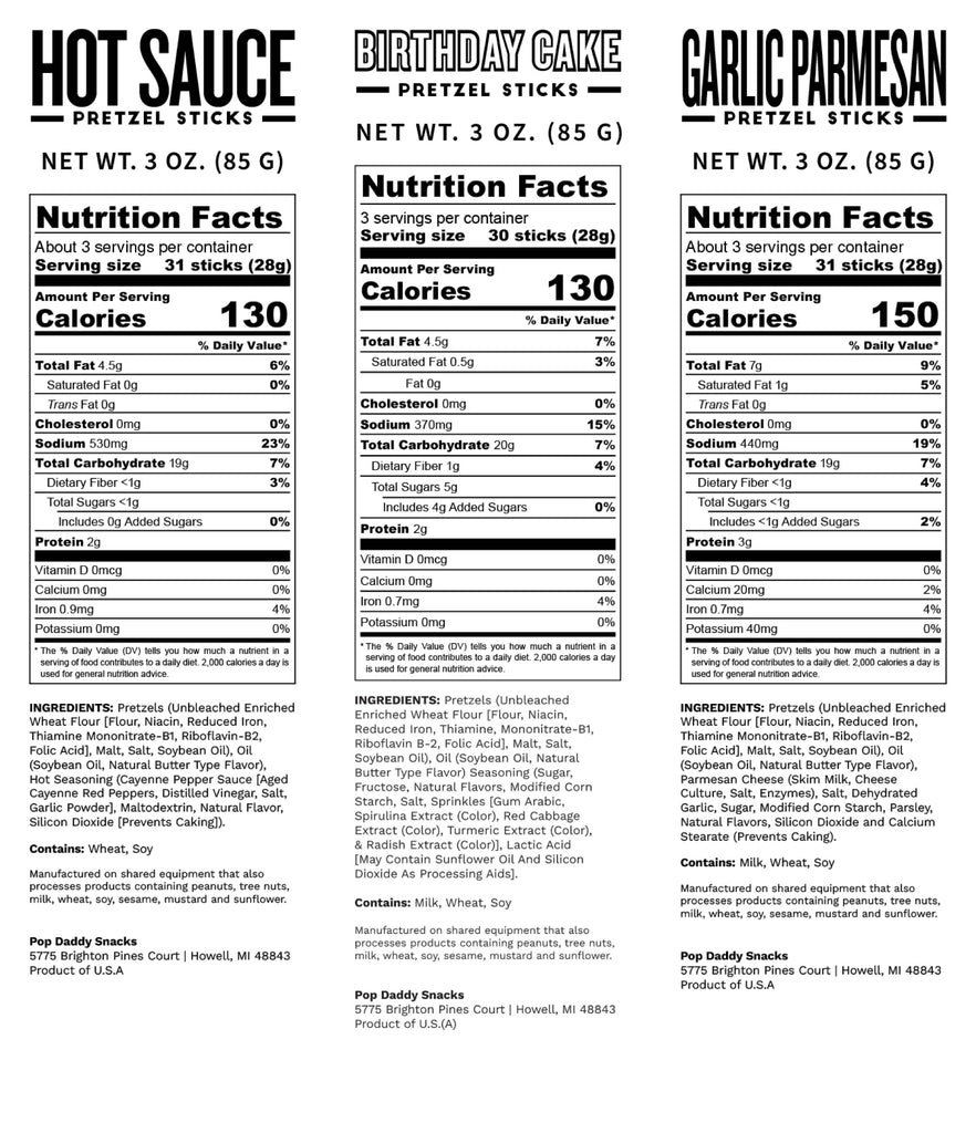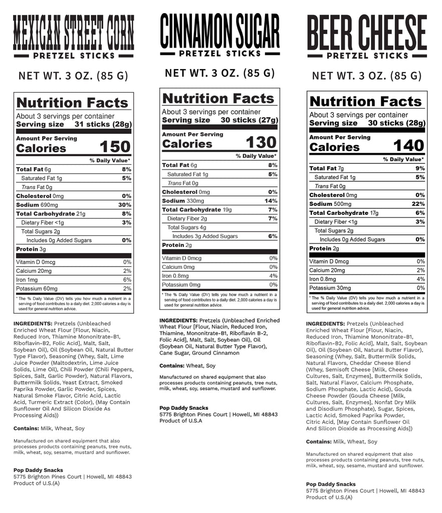 What’s inside: Snack-size pretzels in Hot Sauce, Birthday Cake, Garlic Parmesan, Yellow Mustard, Smoked Gouda, Mexican Street Corn, Dill Pickle, Cinnamon Sugar, and Beer Cheese plus BONUS full-size bags of Buttery Caramel Corn, Dutch Apple Pie, and Strawberry Shortcake.