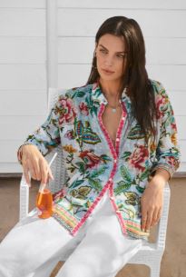 Embellished with a vibrant floral pattern, the Audrey Button Up Shirt is washed in brilliant color. Designed with a button-front and drop shoulders, this mesmerizing shirt is finished with roll-tab sleeves and side slits for a relaxed fit. Pair with palazzo pants and vibrant flats for a polished evening look.