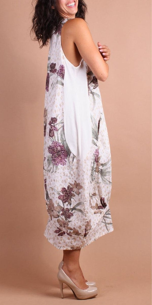 Sleeveless Mid-Length Linen Dress Featuring a Floral Lily Design with Gold Glitter Animal Print. Elastic Side Panels and Pockets.