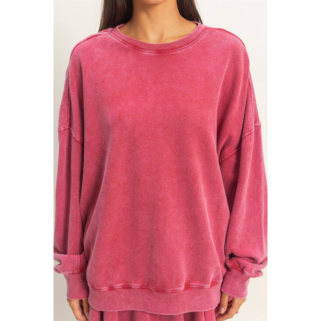 - This sweatshirt is crafted from soft french terry with acid wash. It features a classic ribbed crew neckline, dropped shoulders with full long sleeves and ribbed cuffs. With an oversized fit and distinctive reverse stitching accents on the sleeves and side seams, it pairs well with leggings and casual sneakers. Wear With Heather Gray, Soft Pink, Mint: Dz26a260 Navy: Dz26a328 Model Is 5' 7" Tall, 32" Chest, 23" Waist, 34" Hips And Wearing A Size Small Imported. Designed In The USA