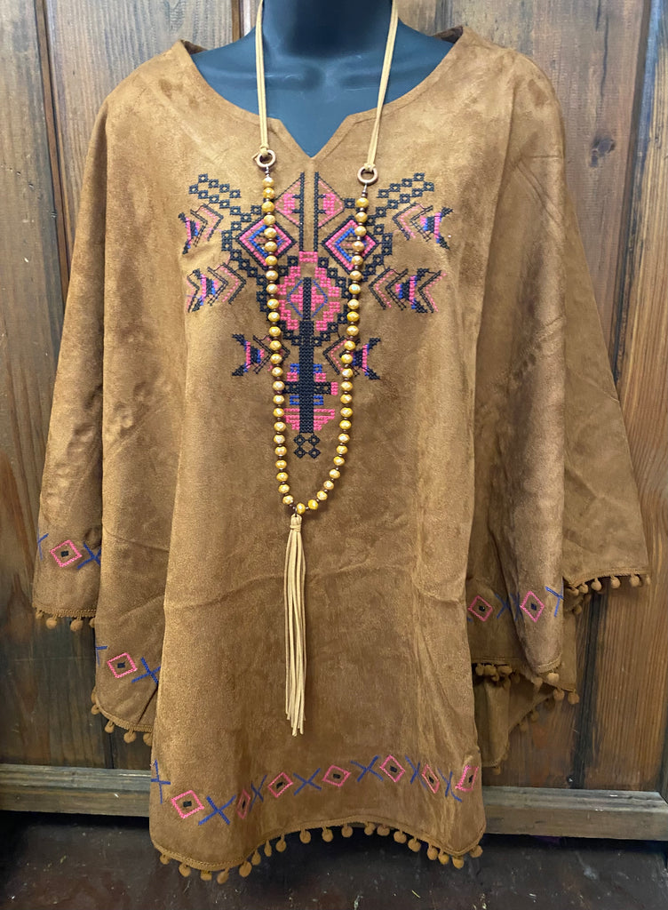 Orange Fashion Village Poncho with embrodiery stitches and tassels. The fabric is made of suade.
