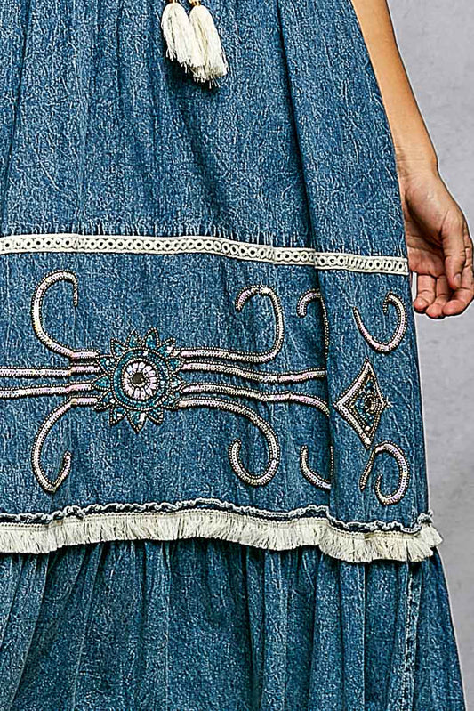 Designed in deep V-neck sleeveless flared slim fit long dress in denim with embroidery with spangle and sequins, emphasized waist smoking detail, trim neck line point, bra adjustable strap, normal washing, solid color.