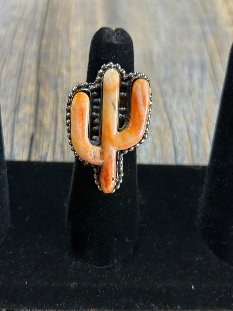 ORANGE COLORSTONE FROM SPINY OYSTER SHELL, WITH TURQUOISE ACCENT ABOVE THE CACTUS ON THE NECKLACE. BOTH FEATURE STERLING SILVER AND THE RING IS ADJUSTABLE