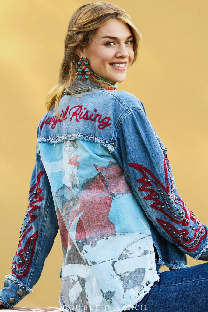 We are all about the embellishment on this little beauty! The classic blue denim is accented by vibrant red Western embroidery, sleek studded trim, silver collar tips, and custom concho buttons, but the focal point is the fabulous adaptation of an artwork by Donna Howell-Sickles, accompanied by the collection moniker in embroidered script.